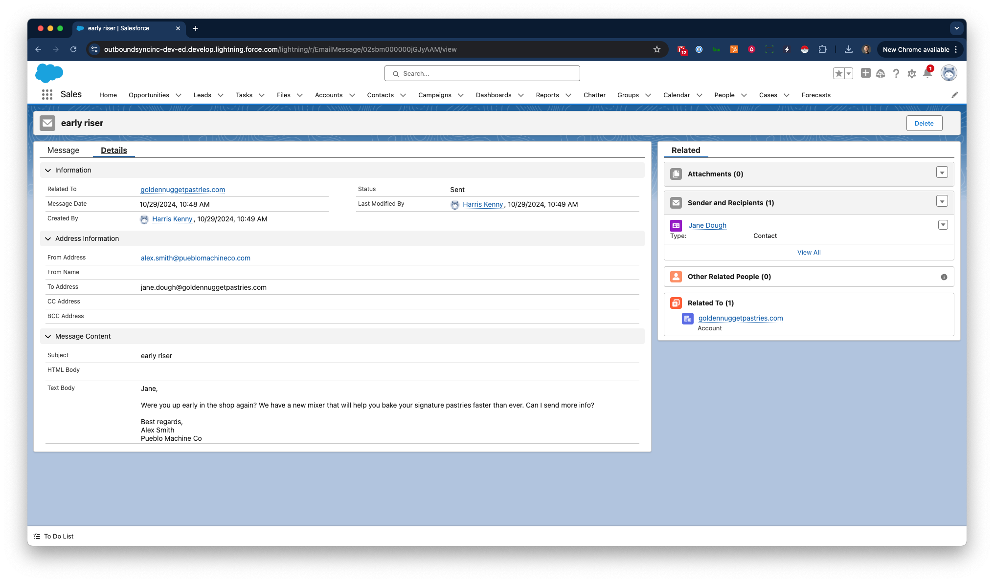 OutboundSync can creates/update new Leads or Accounts/Contacts. Events are stored as Tasks or as EmailMessage records—your choice in the set‑up wizard during onboarding. No Opportunity fields are touched unless you build a Salesforce workflow.